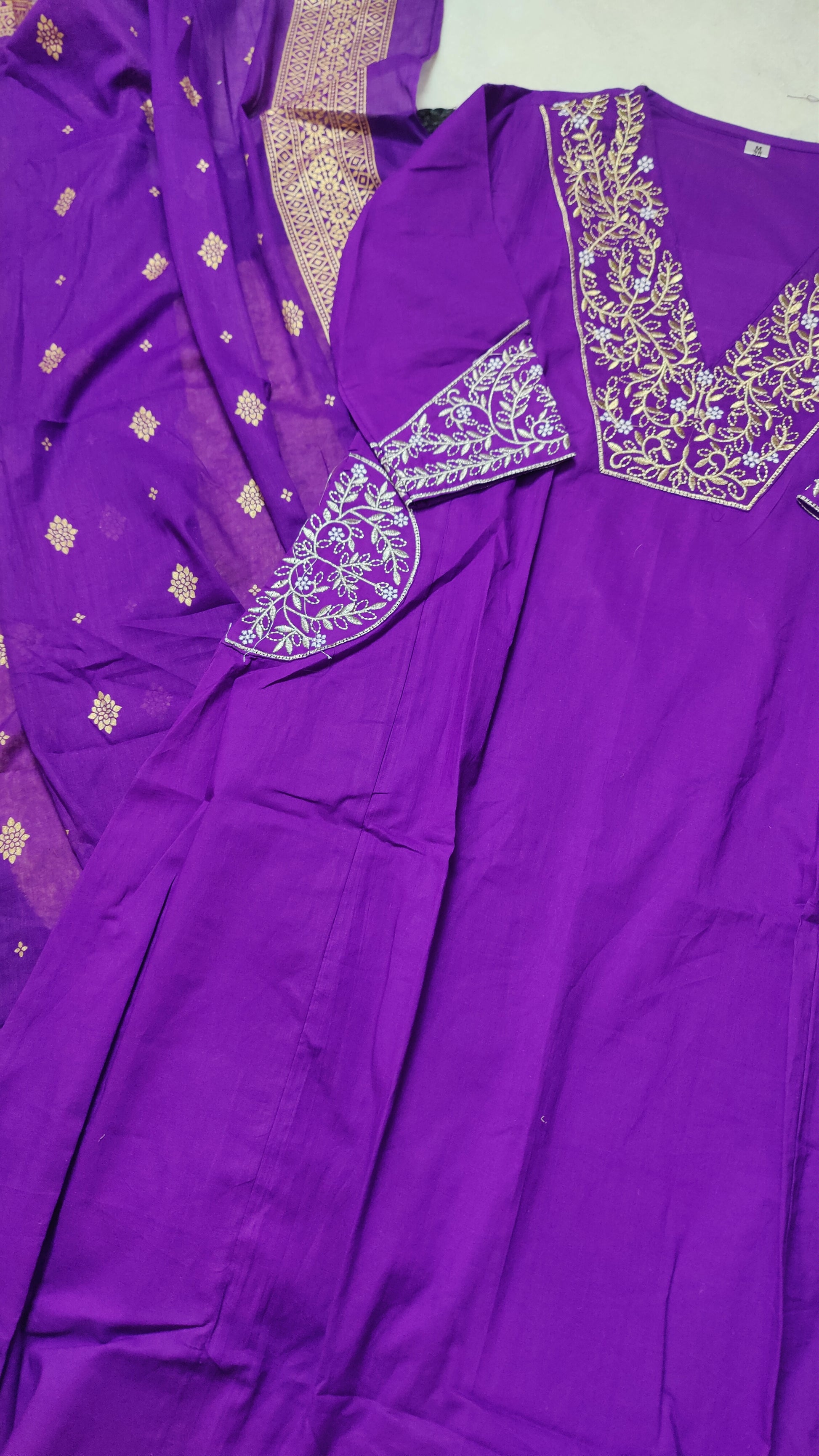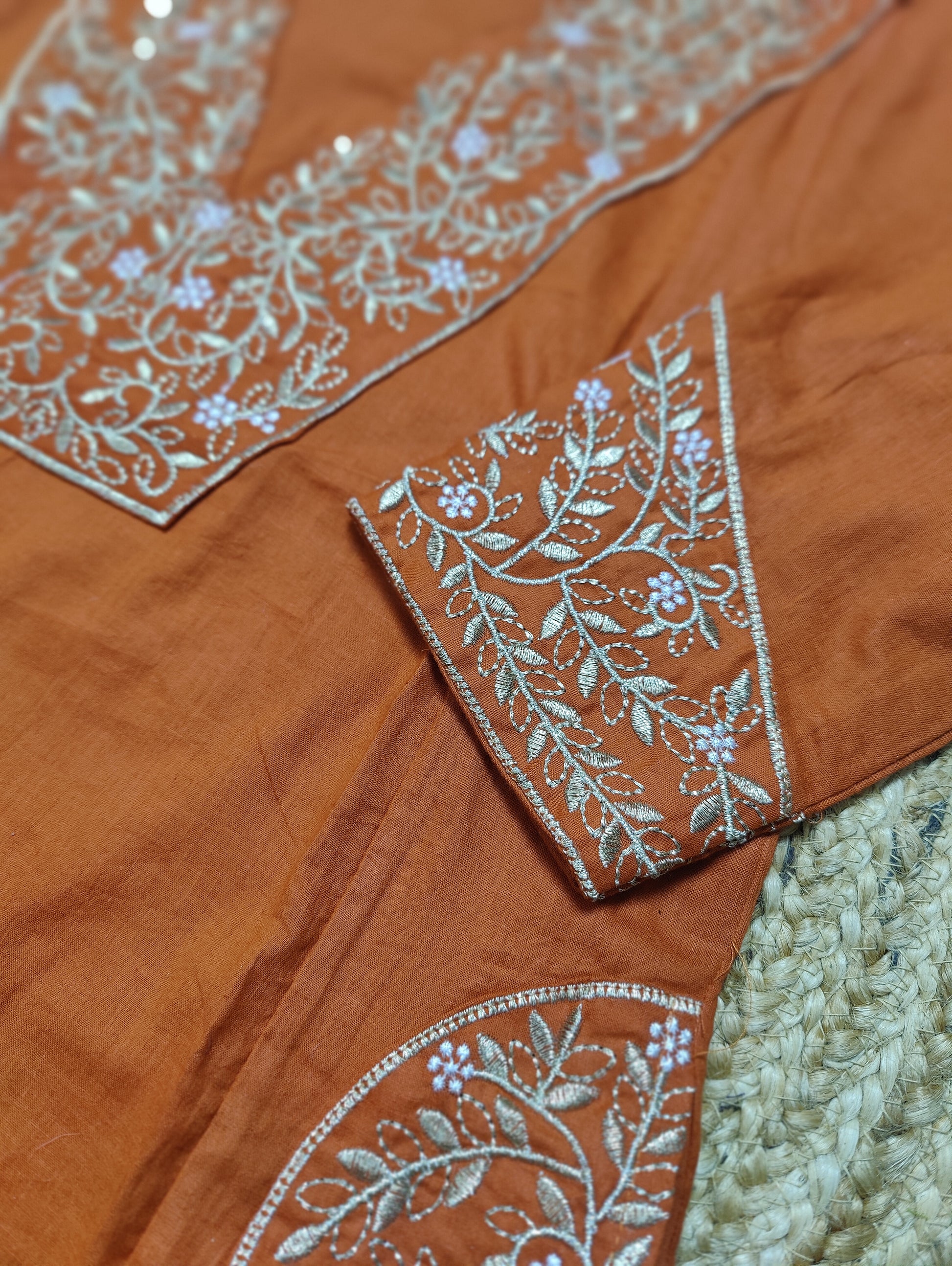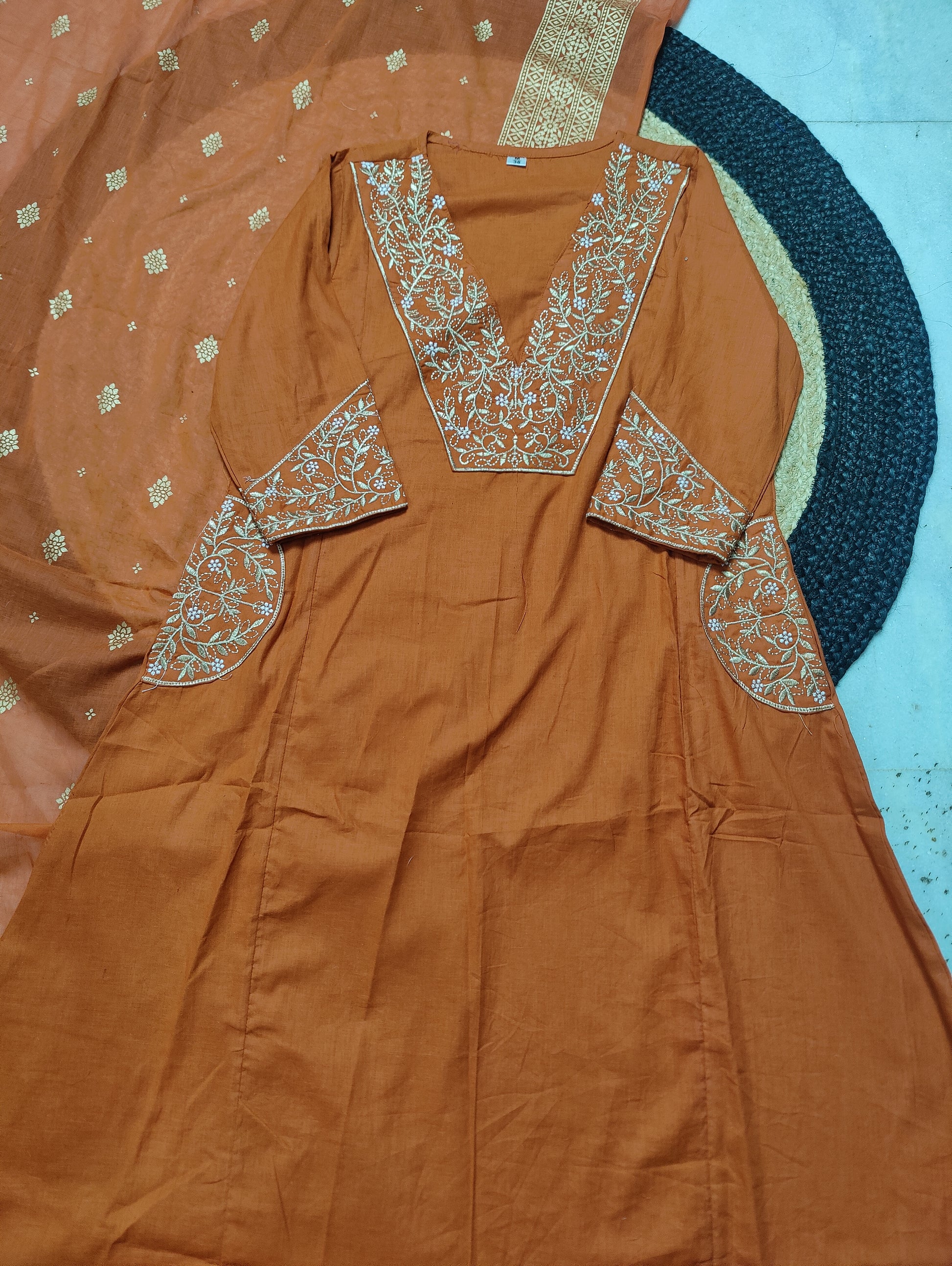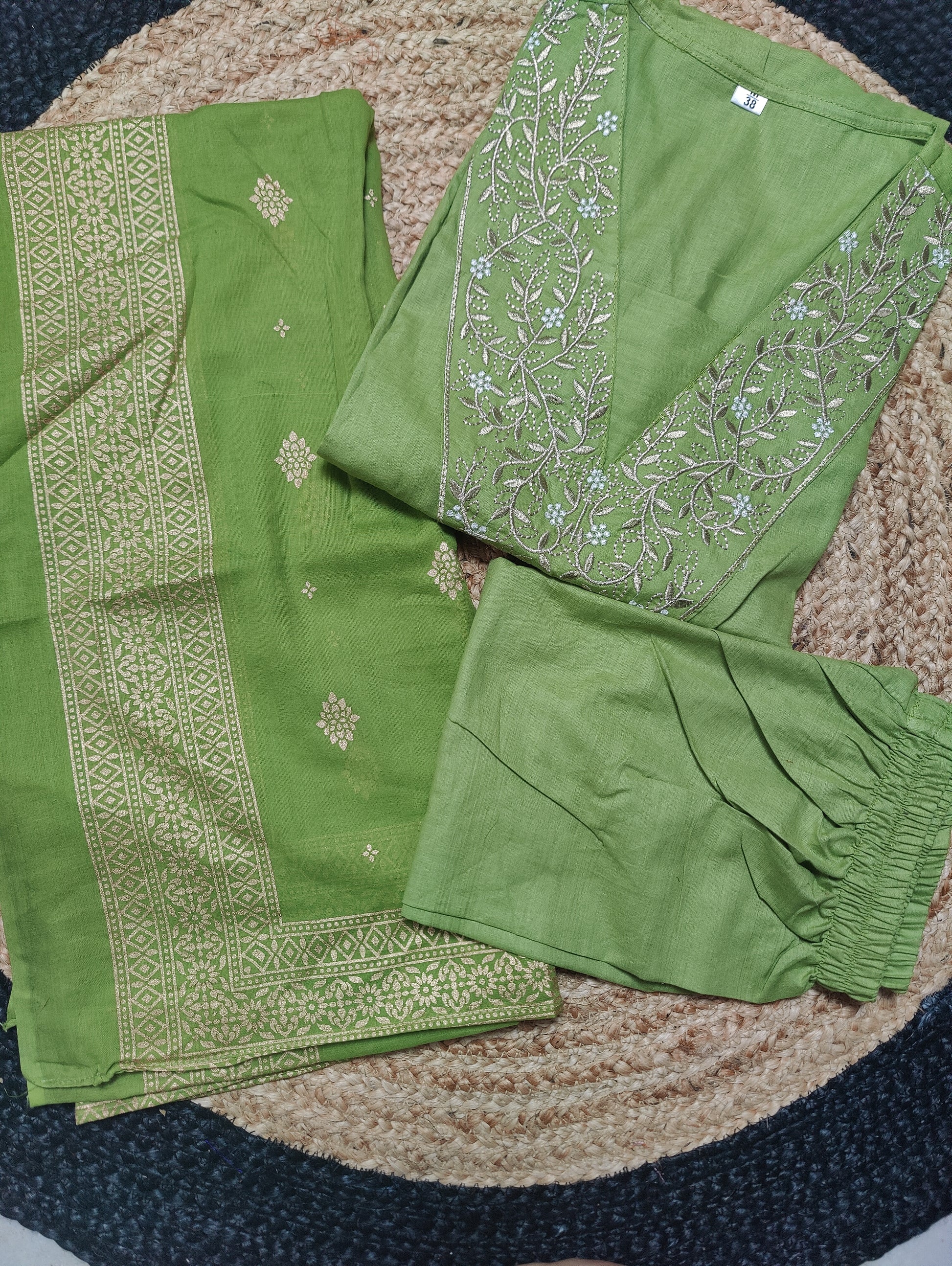 Featuring beautiful Heavy COTTON Suit Set which is beautifully decorated with intricate embroidery work and Zari weaving . It is paired with matching pants and gold printed Dupatta.